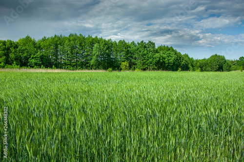 © darekb22, Fototapeta premium Green cereal, trees and clouds in the sky