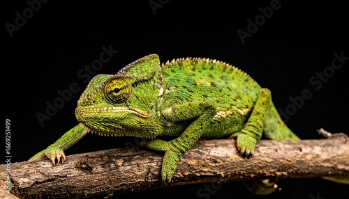 Fototapeta premium Green Chameleon on Branch: A Close-Up Study