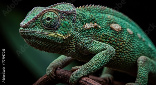 Obraz premium Green chameleon perched on a branch showcasing its vibrant skin texture and...