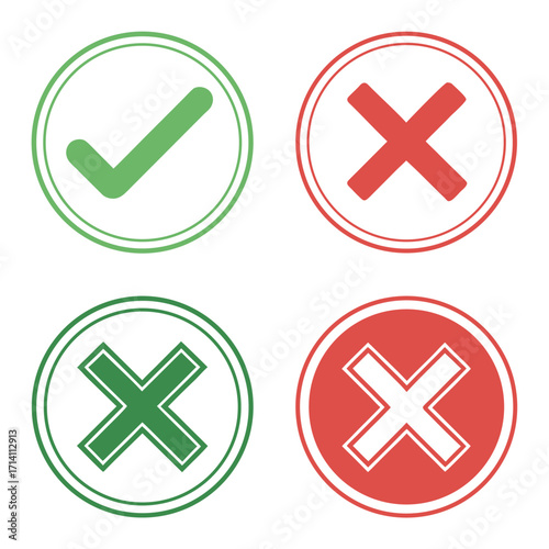 © fazlay907, Obraz premium Green check mark and red cross symbols in circles on white background vector