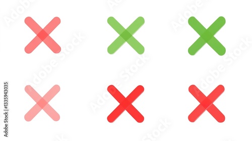 Obraz premium Green check marks and red X marks. Check marks indicate approval. X marks indicate rejection. Simple symbols for yes and no. Clear visual for correct and incorrect. Vector element set.