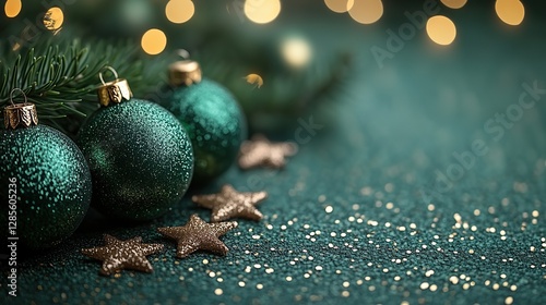 Fototapeta premium Green Christmas tree balls, small glowing stars, and golden sequins are...
