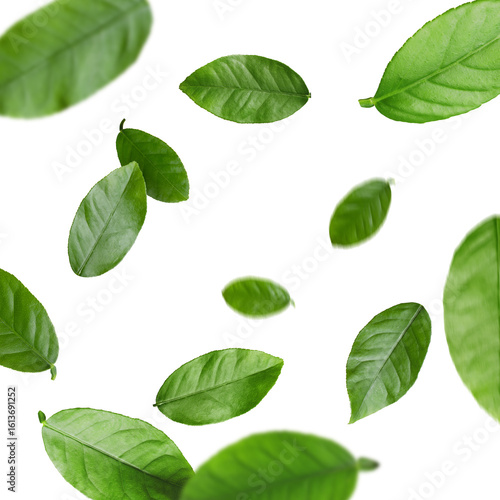 Fototapeta premium Green citrus leaves flying against white background