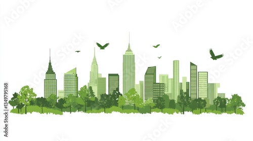 Fototapeta premium Green cityscape with trees and birds; environmentally friendly urban setting; background use