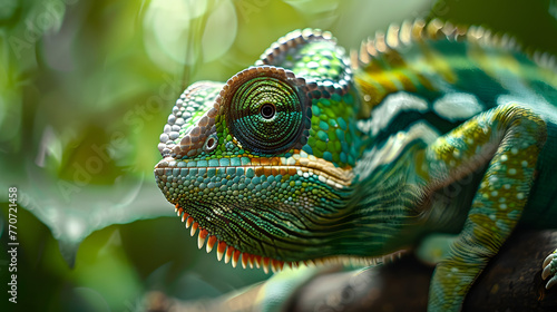 © john, Obraz premium Green colored chameleon close up.