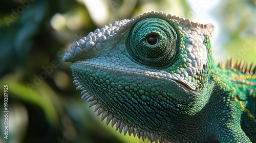 © Johannes, Fototapeta premium Green colored chameleon close up. Generative AI.