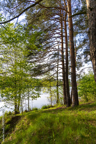 Fototapeta premium Green coniferous trees in the spring forest