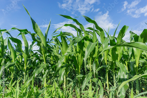© lamyai, Obraz premium Green corn field in agricultural garden and blue sky