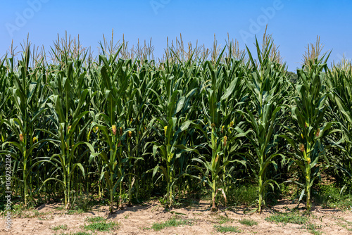 Obraz premium Green corn field under the blue sky