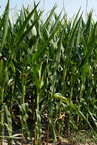 © Sarolta Nagy, Fototapeta premium Green corn field with corn cobs close up.
