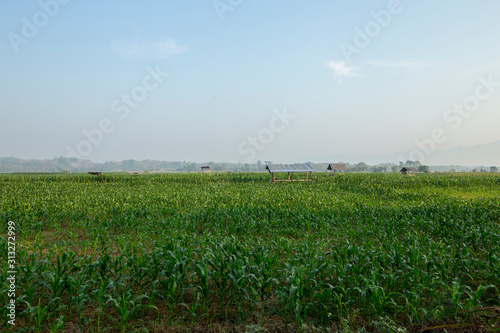 © Kampol, Obraz premium Green Corn fields in the mist.