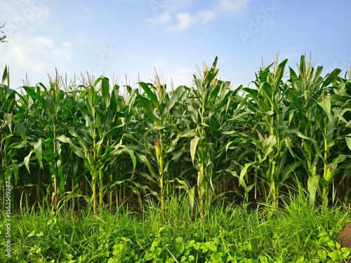 Fototapeta premium green corn fields with a beautiful blue sky in the background