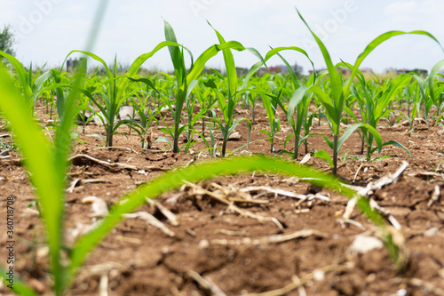 © Doğuhan, Fototapeta premium Green corn maize plants on a field. Agricultural landscape.