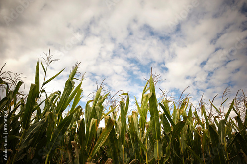 © Cavan, Fototapeta premium Green corn stalks in field under cloudy blue sky