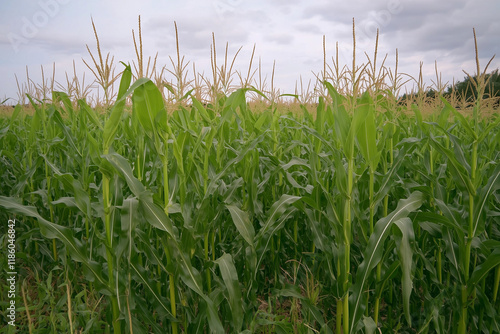 Fototapeta premium Green corn stalks swaying gently in the breeze on a cloudy day in the agricultural fields