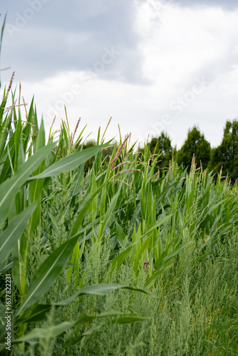 Fototapeta premium Green cornfield under cloudy sky landscape