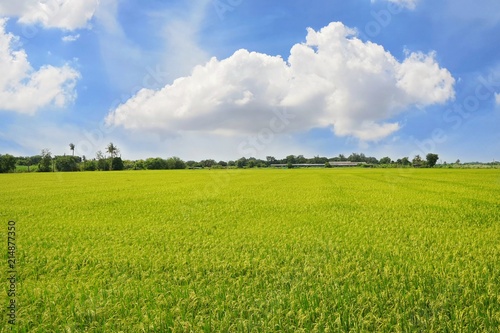 © Dark Caramel, Fototapeta premium Green cornfield with blue sky and clouds in the morning at Thailand, Idea agriculture, Space for text in template, Travel and Ecological concept
