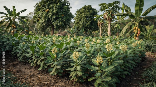 © ghulab, Fototapeta premium Green crop field with fruit trees in tropical farm landscape