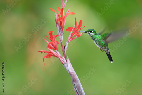 Fototapeta premium Green-crowned brilliant drinking nectar from flower