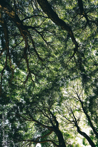 Fototapeta premium Green crowns of trees, view from below