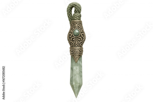 Fototapeta premium Green crystal pendant hanging from a braided cord, adorned with gold...