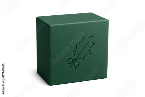 Fototapeta premium Green cube with embossed holly leaf icon representing christmas holiday season symbol, transparent background