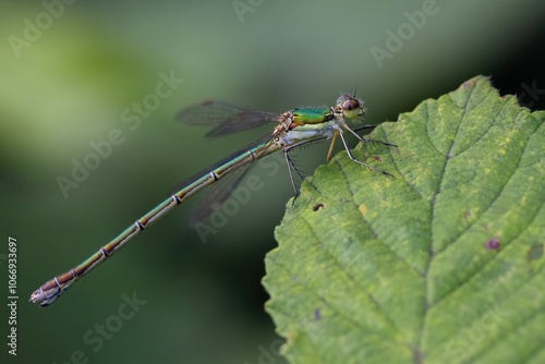 © Wirestock, Fototapeta premium Green damselfly perched on a leaf