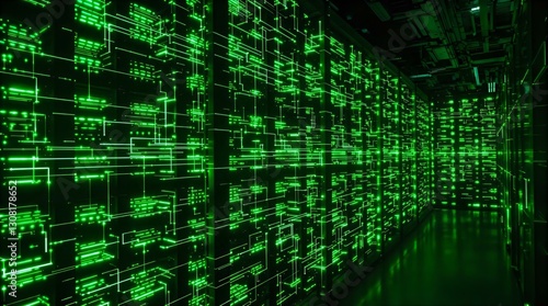© MJ GraPhic, Obraz premium Green Data Center Server Room: High-Tech Computing Infrastructure, Network Hardware, and Data Storage for Cloud Computing Services