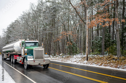 © vit, Obraz premium Green day cab classic bonnet big rig semi truck transporting liquid cargo in tank semi trailer running on the wet winter road with snow on the sides and snowy forest