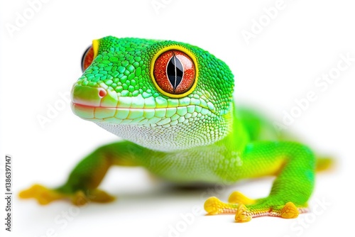 © Dzikrul Husnani, Obraz premium Green Day Gecko Closeup on White Background with Bright Orange Eyes