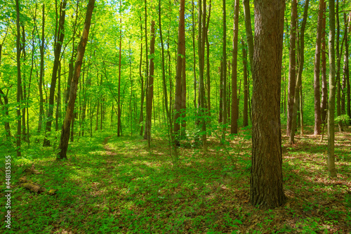Naklejka premium Green Deciduous Forest Summer Nature. Sunny Trees And Green Grass. Woods...