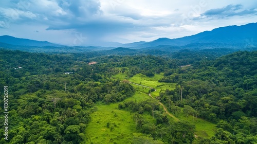 © erlinda, Obraz premium Green dense forest, mountains, dirt road.