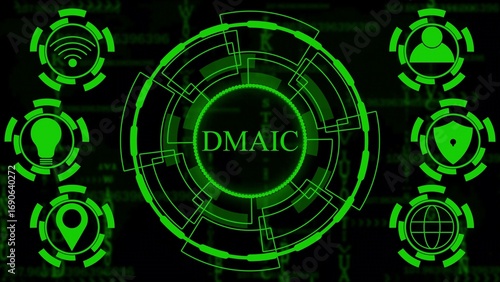 Obraz premium Green digital HUD interface with DMAIC text and icons on a dark binary code...