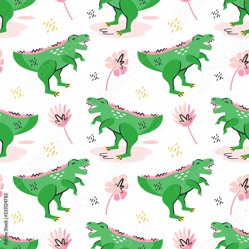 © Fox._.biz, Fototapeta premium Green dinosaurs cute flat hand drawn cartoon vector seamless pattern, background, texture, wallpaper. Prehistoric elements. Ancient animals. Colorful design. Isolated on white background.