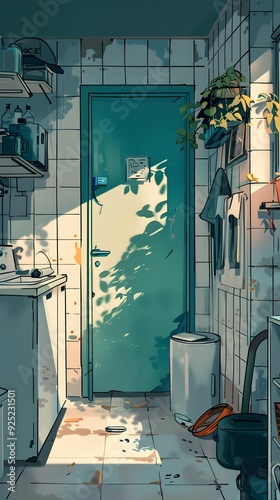 © duyina1990, Obraz premium Green Door and Sunlit Tile Floor in A Laundry Room