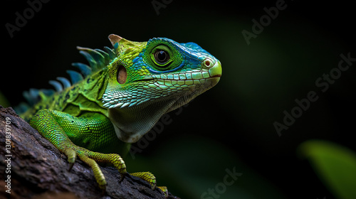 © ArtiShyna, Obraz premium Green dragon lizard perched on tree branch