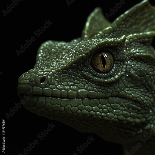 Fototapeta premium Green Dragon Lizard Portrait:Close-up of a fantastical green dragon lizard, its reptilian eye intense and captivating against a black background.