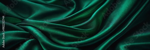 © E, Fototapeta premium Green drapery silk fabric luxury background. Wavy abstract satin cloth vector texture pattern. Smooth shiny drape material curtain. Elegant velvet curve motion image realistic horizontal design.