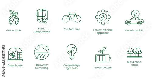 Fototapeta premium Green Earth, Public Transportation, Pollution-Free, Energy Efficient Appliance, Electric Vehicle, Greenhouse, Rainwater Harvesting, Green Energy Light Bulb, Green Battery Vector Icon set