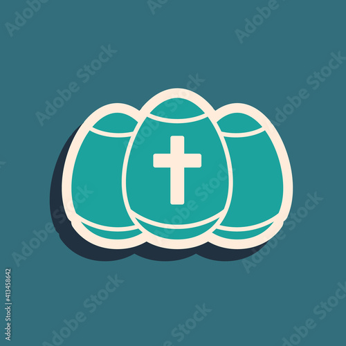 Obraz premium Green Easter egg icon isolated on green background. Happy Easter. Long shadow style. Vector.