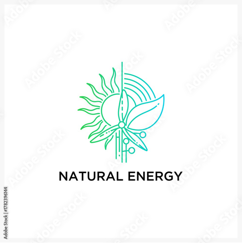 Fototapeta premium Green energy logo concept with sun, wind turbine, and leaf. Renewable power source symbol in a minimalist line art vector illustration