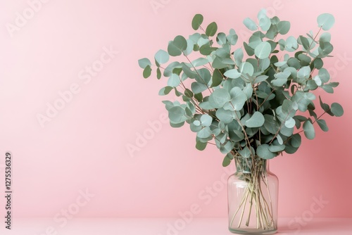 © HO, Naklejka premium Green eucalyptus leaves in vase. Front view. Place for text, copy space, mockup