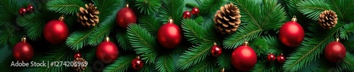 Fototapeta premium Green evergreen branches adorned with red ornaments and pinecones, ornaments,...