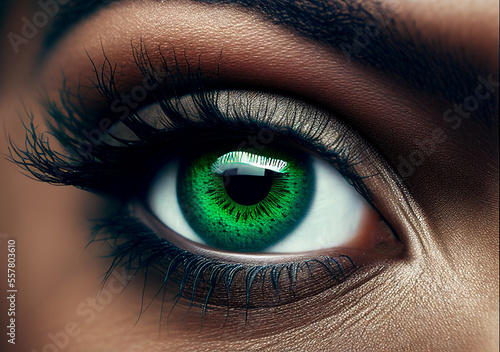Fototapeta premium Green eye with long eyelashes. Concept of make-up and beauty created with generative Ai technology