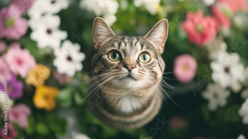 © Photography09, Fototapeta premium Green-Eyed Tabby Cat Gazing Up in Floral Garden, Cat, Flowers