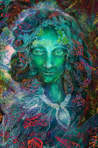 © fluenta, Fototapeta premium green fantasy fairy spirit with leaf ornaments, illustration collage
