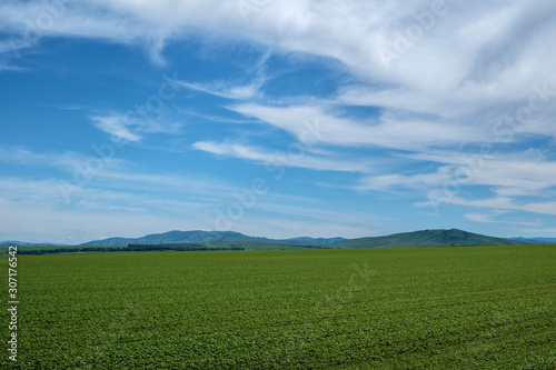 © Arkd, Fototapeta premium Green farm field against the background of distant mountains.