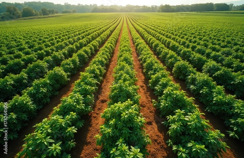 © miss irine, Fototapeta premium Green farm field with rows of blackcurrant bushes under sunny summer sky. Agriculture landscape shows orderly crop cultivation in rural countryside. Natural plant growth pattern on fertile land.