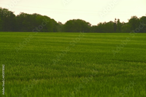 Obraz premium Green field. Agricultural landscape. Path in field of barley grass, green...