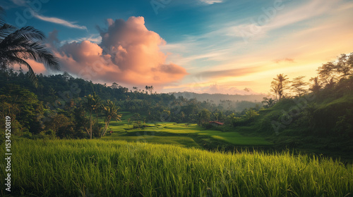 © Pakhnyushchyy, Obraz premium green field and blue sky. field and clouds